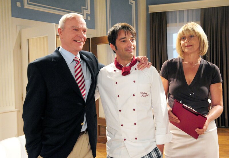 Robert (Lorenzo Patané, M.) hält zu seinem Vater Werner (Dirk Galuba, l., mit Mona Seefried, r.), was die Rückgewinnung der Hotelanteile anbelangt.