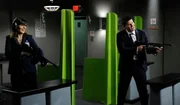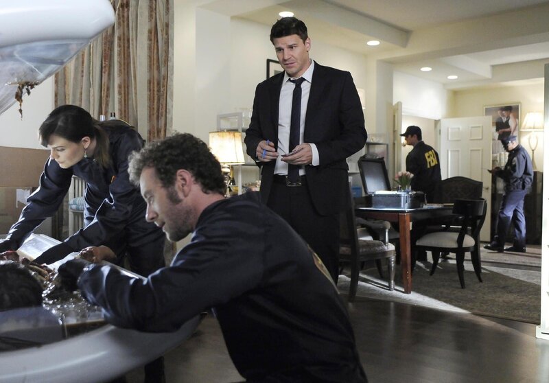 Agent Booth (David Boreanaz, Mi.) verfolgt angewidert die Arbeit von Brennan (Emily Deschanel, li.) und Hodgins (T.J. Thyne), die die schleimigen Überreste einer Leiche untersuchen, die zu lange unter dem Solarium gelegen hat.