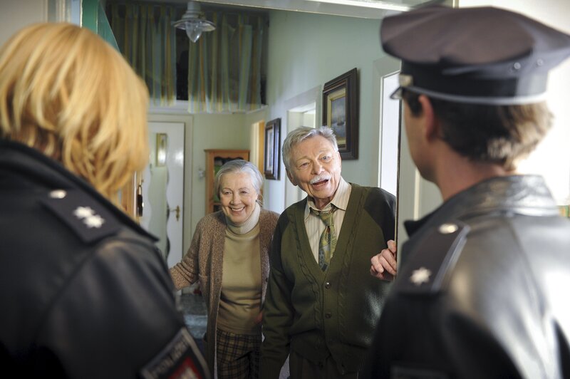 • Melanie (Sanna Englund, l.) und Mattes (Matthias Schloo, r.) auf der Suche nach Augenzeugen. Käthe (Kyra Mladeck, 2.v.l.) und Dieter Krieger (Uwe Friedrichsen, 2.v.r.) haben den Überfall im Museum beobachtet.