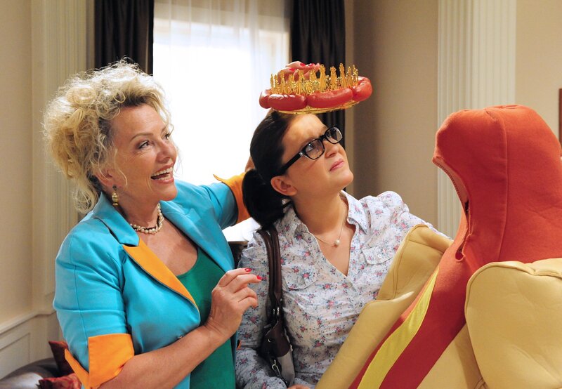 • Rosi Zwick (Veronika von Quast, l.) präsentiert der entgeisterten Sibylle (Julia Mitrici, r.) das Wurstkönigin-Kostüm.