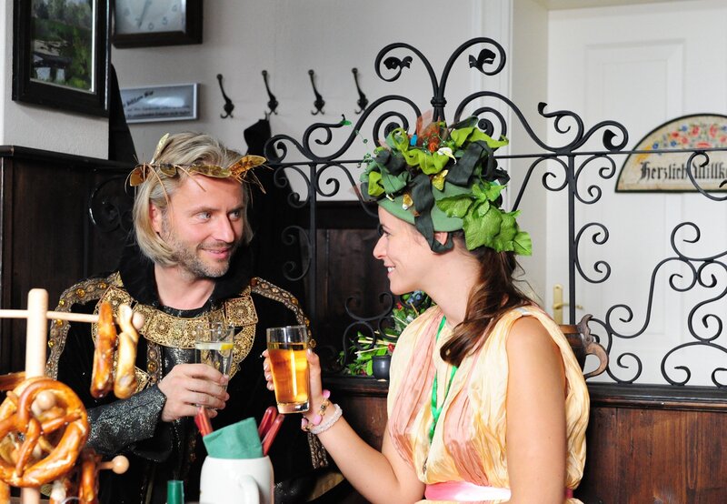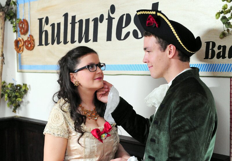 Xaver (Jan van Weyde, r.) bezaubert Sibylle (Julia Mitrici, l.) beim Kulturfest mit seinem charmanten Auftritt.
