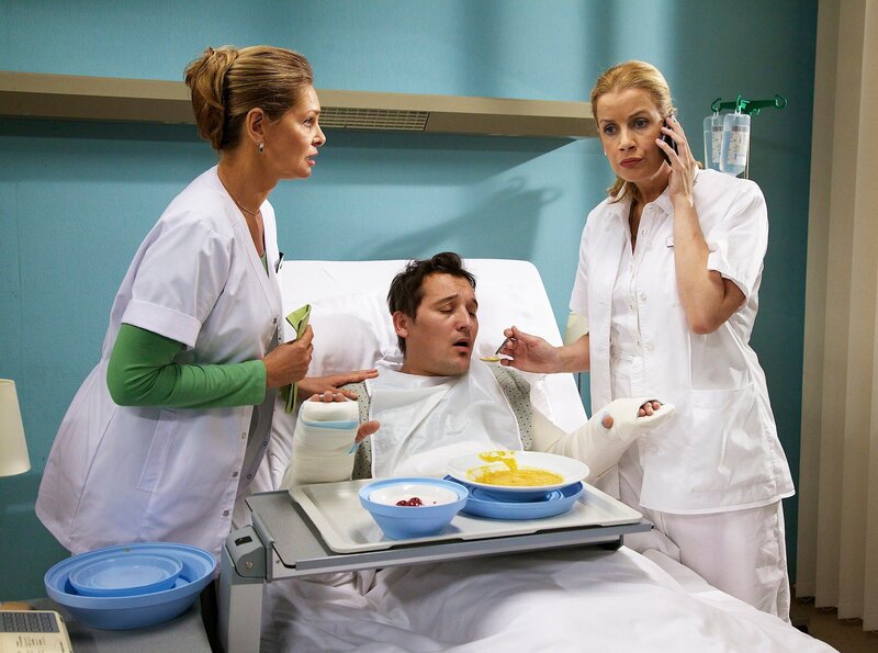 Verwaltungschefin Sarah Marquardt (Alexa Maria Surholt, rechts) ist mit einem außergewöhnlichen Vorschlag von einem Managementseminar zurückgekommen: Um die Aufgaben und Probleme des Pflegepersonals besser verstehen zu können, möchte sie ein paar Tage als Lernschwester Sarah mitlaufen. Doch weder Schwester Yvonne (Maren Gilzer, links) noch die Patienten (Mario Rothe-Frese) sind von dieser Idee besonders begeistert.