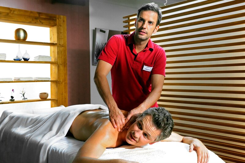 Aus Ärger, weil Dr. Erhardt (Timothy Peach, u.) seiner Tanja den OP-Floh ins Ohr gesetzt hat, massiert Nils (Florian Stadler, r.) ihn absichtlich hart.