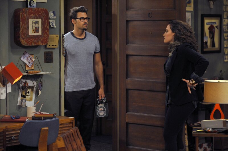 Johnny (Nick Zano, l.) wurde von Caroline (Beth Behrs) zum Aufbau ihres neuen Schrankbettes in die WG bestellt. Die von dem unverhofften Besuch überrumpelte Mitbewohnerin Max (Kat Dennings, r.) ist außer sich: Johnny scheint ihr wohl doch mehr zu bedeuten, als sie anfangs vermutete ...