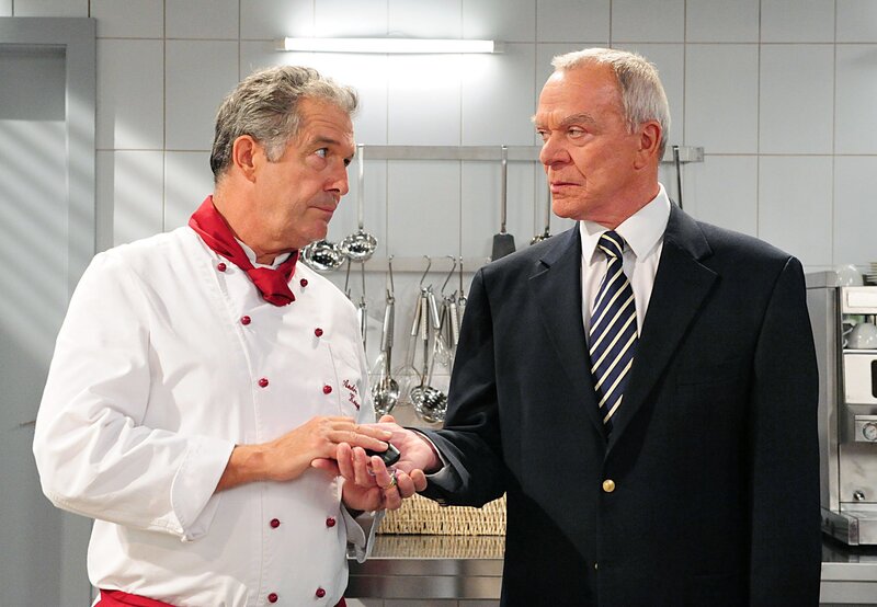 Werner (Dirk Galuba, r.) will André (Joachim Lätsch, l.) keinen Wagen aus dem Fürstenhof-Fuhrpark für die Bierlieferung zur Verfügung stellen.