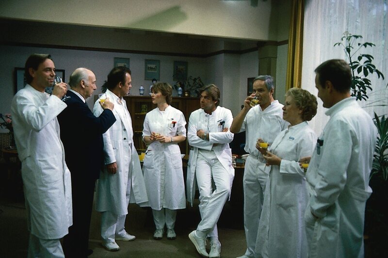 • Die neue Anästhesistin Katharina Gessner (Ilona Grübel) wird von Prof. Brinkmann (Klausjürgen Wussow) den engeren Mitarbeitern vorgestellt (v.l.n.r.: Holger Petzold, Alf Marholm, Ilona Grübel, Sascha Hehn, Franz Rudnick, Eva Maria Bauer, Karl Walter Diess).