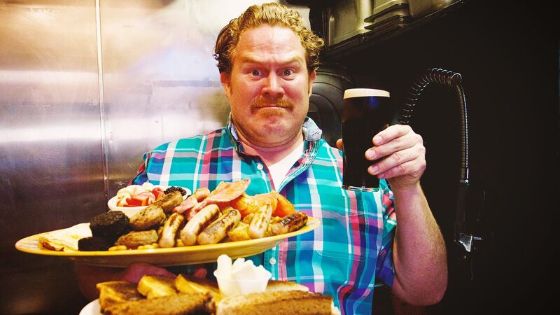 Host Casey Webb poses with the Flann O'Brien's Guinness Breakfast Challenge, as seen on Man v. Food.