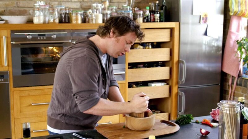 Jamie Oliver bereitet in 30 Minuten ein komplettes Menü zu, dessen Hauptgang aus Hähnchenspießen mit Satay-Soße besteht. Dazu reicht er einen Nudelsalat mit Cashewnüssen und Koriander sowie Früchte mit Minzzucker als Dessert.