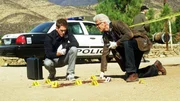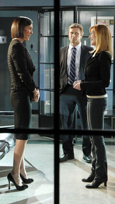 • Catherine (Marg Helgenberger, re.), die mit Agent McQuaids (Grant Show, hi.) Unterstützung an dem Fall Newbury arbeitet, trifft zufällig auf ihre alte Freundin Laura (Annabeth Gish), die ihren Mann zu einer Befragung begleitet hat.