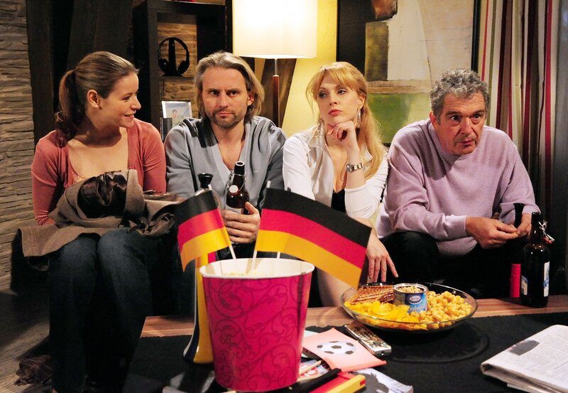 Gitti (Kathleen Fiedler, l.) und Rosalie (Natalie Alison, 2.v.r.) geben sich als Fussballfans aus und schauen mit Michael (Erich Altenkopf, 2.v.l.) und André (Joachim Lätsch, r.) ein Spiel im Fernsehen an.