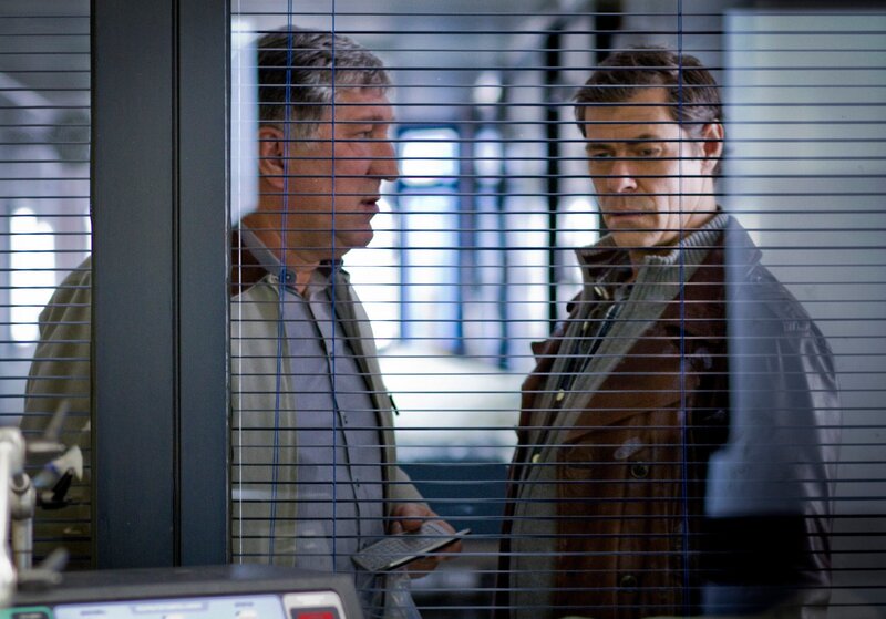 ARD HEITER BIS TÖDLICH - MORDEN IM NORDEN, neue Krimiserie am Vorabend mit 16 Folgen, Folge 5 "Der Besuch der alten Dame", am Dienstag (20.03.12) um 18.30 Uhr im Ersten. Schroeter (Veit Stübner, l.) und Finn Kiesewetter (Sven Martinek, r.) stellen entsetzt fest: Der Lübecker Privatdetektiv, zu dem Marie Guteson vor ihrem Tod zuletzt Kontakt hatte, liegt vernehmungsunfähig im Krankenhaus.
