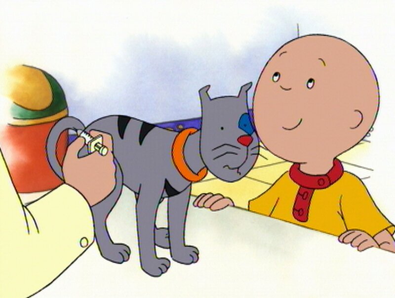 Caillou streichelt den ängstlichen Kater Gilbert, der große Angst vorm Tierarzt hat.