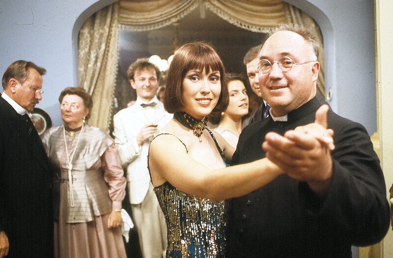 • Stolz nimmt der Pfarrer (Hermann Wächter, rechts) am Polterabend die Aufforderung zum Tanz durch Sara Kampensi (Gisela Freudenberg) an. Der Rest der Familie staunt amüsiert. Im Hintergrund von links: Polzist Grüner (Gerd Fitz), Oma Soleder (Franziska Stömmer), Kurt Soleder (Michael Lerchenberg) und Sara Soleder (Christine Neubauer).