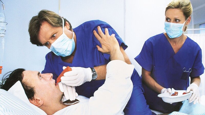 Entsetzt stellt Dr. Christian Roehrs (Siemen Rühaak) fest, dass nach dem Facelifting bei Valerie von Mantritz (Franziska Bronnen) eine Gesichtslähmung aufgetreten ist.