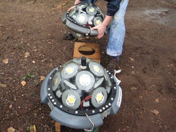 • Pisté, Mexico - Eric Berkenpas works with National Geographic sun spheres. These sun spheres will light up the abyss of the cenote like never before.