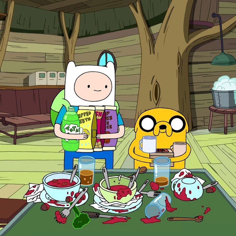 Bottom to top: Finn (Jeremy Shada) ,Jake (John DiMaggio)