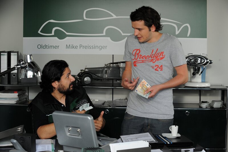 Flori ist sich sicher, dass Tuncay das Minus in der Tankkasse zu verantworten hat. Von links: Geselle Tuncay (Levent Özdil) und Florian Brunner (Tommy Schwimmer).