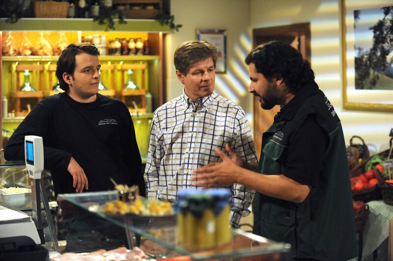 • Tuncay ist sich sicher, dass Flori das Geld aus der Tankkasse verschlampt hat. Von links: Florian Brunner (Tommy Schwimmer), Roland Bamberger (Horst Kummeth) und Geselle Tuncay (Levent Özdil).