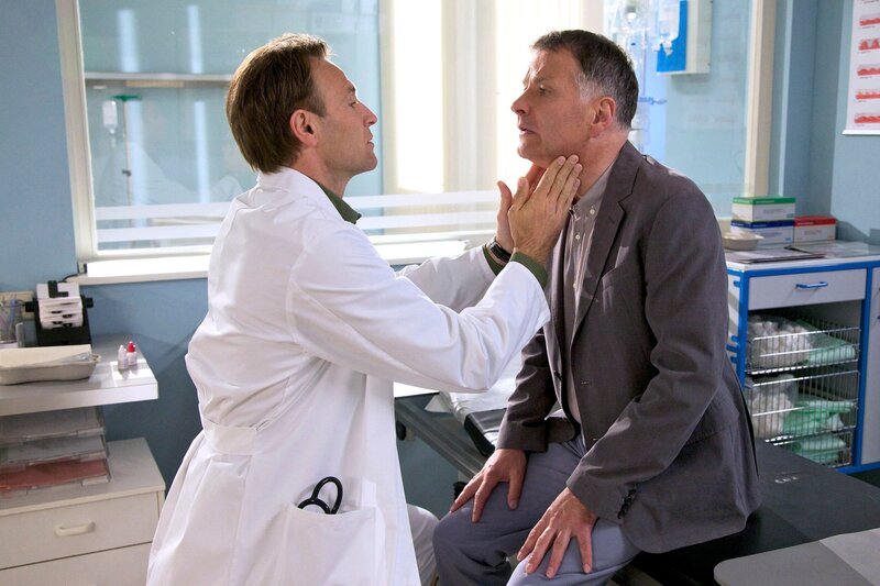 • Pia und Roland Heilmann (Thomas Rühmann, rechts) planen einen Kurzurlaub. Beide freuen sich auf ein paar erholsame Tage, doch kurz vor Reiseantritt plagen Roland Halsschmerzen. Eine Untersuchung durch seinen Freund Dr. Martin Stein (Bernhard Bettermann) ergibt, dass er eine eitrige Mandelentzündung hat. Da Pia gerade den dritten Zyklus ihrer Chemotherapie hinter sich hat, fürchtet Roland, er könne seine Frau anstecken.
