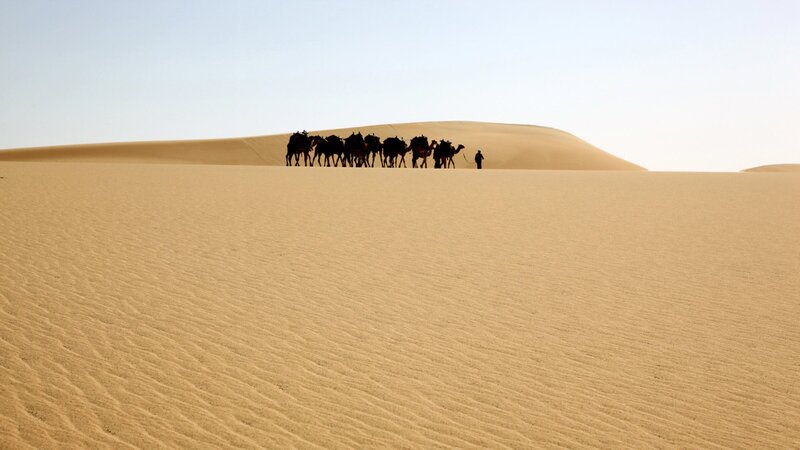 Die gelbe Sahara ist die Bilderbuchwüste: Sandmeere wogen, Dünen ziehen vorbei. Dattelpalm-Oasen unterbrechen die beschwerliche Reise. Eine Fata Morgana erscheint in der Ferne. Die Sahara beeinflusste nachhaltig die abendländische Kultur des 19. Jahrhunderts. Doch feiner Sand wie in der Sahara bedeckt nur 20 Prozent aller Wüsten. Ägypten kann sich damit rühmen, dass fast die Hälfte seines Wüstenanteils sandbedeckt ist. Die Oase Siwa, berühmt durch das Orakel des Amun-Re, liegt knapp 40 Meilen entfernt von der libyschen Grenze und gehört damit zu den entlegensten Orten West-Ägyptens. Erst seit die schnurgerade vierspurige Wüstenstraße von Marsa Matruh am Mittelmeer durch die Sahara gezogen wurde, ist Siwa nicht nur wie bisher für Karawanen, sondern auch für Touristen erreichbar. Doch Siwa ist nicht Kairo oder das berühmte Tal der Könige. Die Oasen sind anders und ihre Bewohner auch. Traditionsverbunden und oft im Einklang mit der Natur wenden sich viele von dem ab, was wir Fortschritt nennen oder womit wir uns materiell und dinglich umgeben. An saftigen, grünen Palmenhainen, zwischen Olivenbäumen, Obstgärten und komfortablen Hotels beginnt die Reise. Aus der flachen Geröllwüste wird nach der lauten Oase Bahariya langsam der ersehnte Wüstentraum. Doch erst mit Farafra eröffnet sich die richtige Märchenwelt. Der Besuch in der Karawanserei ist ein Abenteuer an sich. Mehr als hundert Kamele bestaunen neugierig die Regisseurin, schmiegen sich an oder schnuppern an ihr herum. Mit ihren langen Hälsen sind sie schnell und beweglich. Zwar beklagen die für eine Karawane ausgewählten 13 Tiere zunächst einmal lautstark die Trennung von ihrer Herde, aber schon nach wenigen Stunden ist alles vergessen und der gleichmäßige Rhythmus ihres Ganges gibt das Tempo der Reise vor. Die Landschaft entlang der alten Karawanenstraße von Farafra nach Dakhla - ein Weg, der zu Fuß neun Tage dauert - überrascht mit ungeahnten Kalksteinformationen, Gebirgen, Pyritfeldern, Fossilien und schier unglaublichen Dünenketten. Sand gibt es hier in allen erdenklichen Tönen: von Beige oder Ocker zu Gelb und Orange. Das Holz, das am Tage aufgesammelt wird, verbrennt am Abend in einem wärmenden Feuer. Die Beduinen stellen einen Windschutz auf und legen Matratzen zum Schlafen in den Sand. Ein leckeres Essen wird praktisch aus dem Nichts gezaubert und der Abend - unter einem atemberaubenden Sternenhimmel - endet mit Musik und süßem Tee. Doch die Musik dient nicht nur der Unterhaltung. Mit Gesang werden auch Streitgespräche ausgefochten und Geschichten weitergegeben. Der Augenblick zählt, das Zusammensein in dieser unglaublich weiten Einsamkeit. Die Magie der Wüste holt jeden ein, der sie erlebt. "Wer die Wüste nicht kennt und ihren Atem nie gespürt hat, wird sein Leben lang erfüllt sein von Sehnsucht", sagt eine alte beduinische Weisheit.
