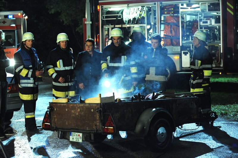 Die Feuerwehrler glauben, dass ein Feuerteufel sein Unwesen treibt. Von links: Sebastian Wildner (Herbert Ulrich), Roland Bamberger (Horst Kummeth), Monika Vogl (Christine Reimer), Mike Preissinger (Harry Blank), Florian Brunner (Tommy Schwimmer) und Xaver (Michael Schreiner).