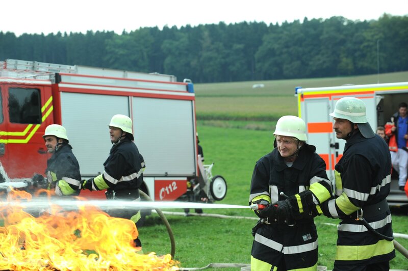Xaver (Michael Schreiner) und die anderen Feuerwehrler versuchen, den Brand zu löschen.