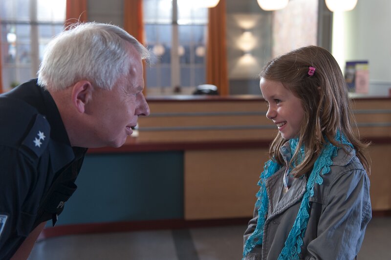 Luise (Lilly Rose Barshy, r.) kommt als kleine Detektivin gern ins PK 21, um Wolle (Harald Maack, l.) ihre Beobachtungen zu melden.