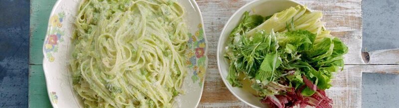 Jamie zaubert heute köstliche Fettucine, geräucherten Fisch, Spargel und Erbsen auf den Tisch. Außerdem gibt es Burger aus Hackfleisch und schwarzen Bohnen, Nudeln und Salat.