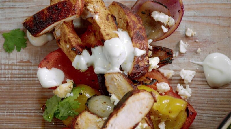 Heute kommt kein Geschmacksnerv zu kurz. Jamie kocht knusprige Hühnchen-Fajitas, gegrillte Paprika mit Dip, Reis und Bohnen und einen feinen Krabbencocktail. Dazu gibt es in der Pfanne geröstetes Weißbrot.