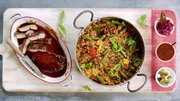 Heute stehen glasiertes Schweinefilet, pfeffriger Reis und eine rauchige Barbecue-Sauce auf dem Speiseplan. Wer Lust hat, probiert sich außerdem an einer ofenfrischen Bruschetta und goldbraun gegrillten Sardinen.