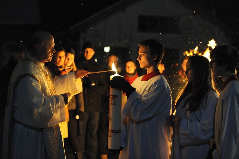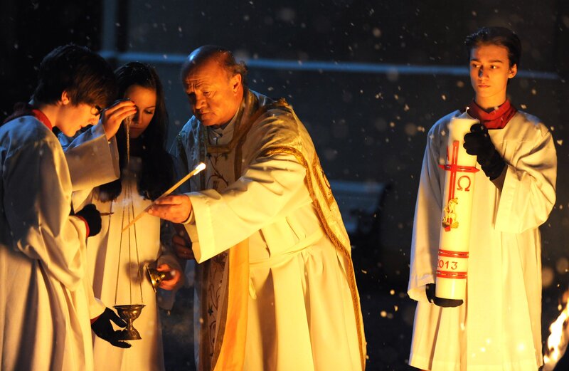Pfarrer Kurz (Hans Stadlbauer) zündet vor der Gemeinde die Osterkerze an.