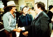 • Charles Ingalls (Michael Landon, l.) versucht Dillon Hyde (Liam Sullivan, r.) zu beruhigen. Er hatte sich seiner Frau gegenüber etwas "rabiat" verhalten. Caroline (Karen Grassle, M.) verfolgt die Szene mit Unbehagen.