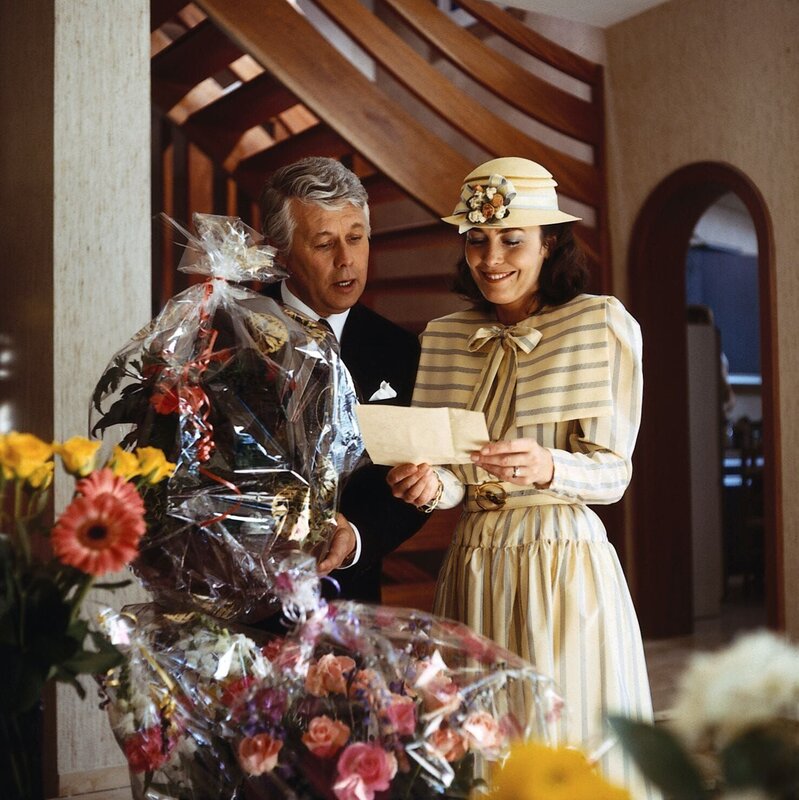 • Vor der Fahrt zum Standesamt betrachten Angi (Thekla Carola Wied, r.) und Werner (Peter Weck, l.) noch die Blumen und Glückwünsche.