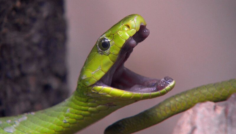 Bei der Fütterung ist die Grüne Mamba sofort in Beißlaune.