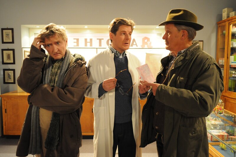 • Bamberger diskutiert mit Xaver und Schattenhofer über den Namen seiner Apotheke. Von links: Xaver (Michael Schreiner), Roland Bamberger (Horst Kummeth) und Lorenz Schattenhofer (Werner Rom).