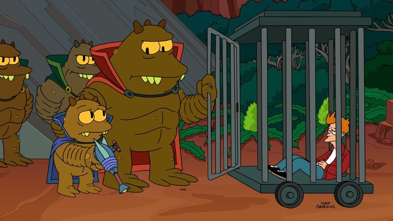 Lrrr verlangt von Jrrr (m.), dass er sein Haustier Fry (r.) umbringen soll. Nur durch die Freundschaft zwischen den beiden und durch das beherzte Eingreifen von Bender kann Frys Leben gerettet werden ...