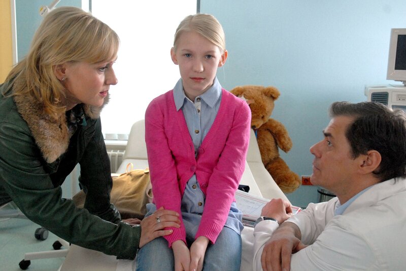 ARD TIERÄRZTIN DR. MERTENS IV. Staffel mit 13 neuen Folgen, Folge 48, "Was zusammen gehört". Judith Möhring (Dana Golombek, l.), die attraktive ehemalige Studienkollegin von Kinderarzt Dr. Christoph Lentz (Sven Martinek, r.), macht sich große Sorgen um ihre autistische Tochter Alena (Carla Sewczyk, M.).