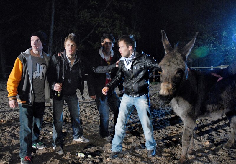 Auf frischer Tat ertappt. Theo (Meo Wulf, 2. v. li.) und seine Kumpel (Kevin Köppe, Kai Mößner, Komparse) haben sich heimlich in den Zoo geschlichen, um mit dem Esel Party zu machen.