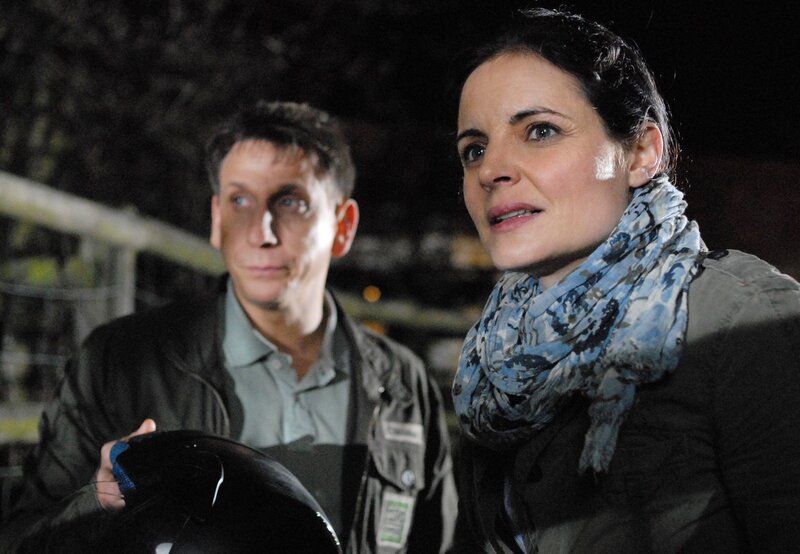 Nächtliche Eindringlinge im Zoo! Dr. Susanne Mertens (Elisabeth Lanz, r.) und Conny (Thorsten Wolf, l.) sind zu spät gekommen. Nur den Helm von einem der illegalen Besucher konnten sie sicherstellen.