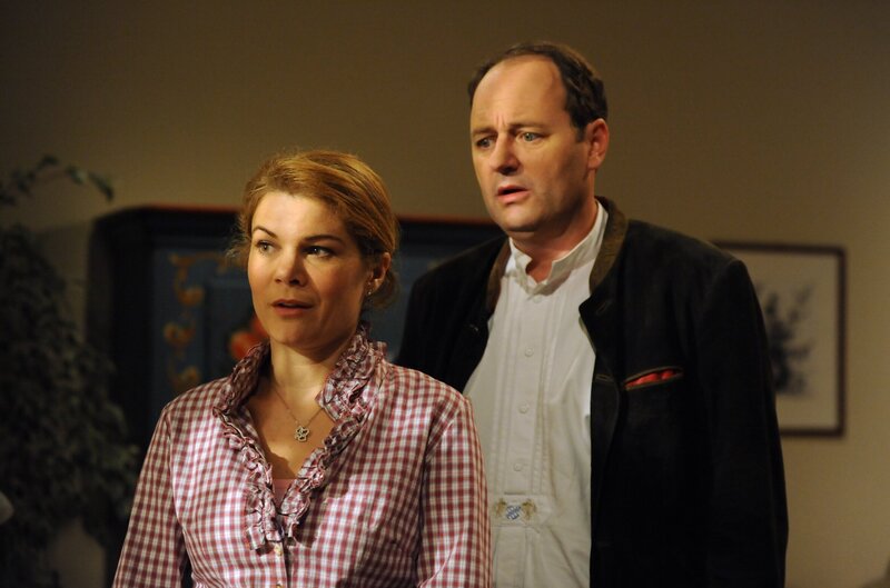 Uschi ist hin und her gerissen, als Hubert sie bittet, da zu bleiben. Von links: Uschi Guggenmoser (Silke Popp) und Hubert Kirchleitner (Bernhard Ulrich).