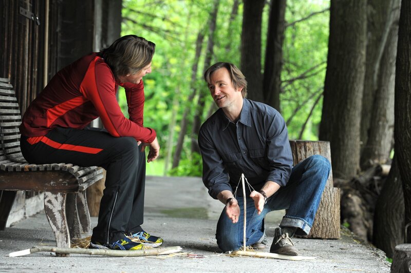 Gregor hat Felix versprochen, ihm zu zeigen, wie man per Hand ein Feuer macht und übt deshalb heimlich. Von links: Sebastian Wildner (Herbert Ulrich) und Gregor Brunner (Holger M. Wilhelm).