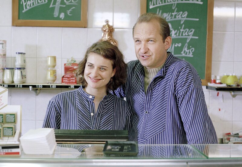 Fischhändler Biesen (Peter Heinrich Brix, r.) und seine Frau Margit (Marie Rönnebeck, l.) freuen sich über Ehrenbergs Besuch. MDR Fernsehen: DER DICKE, Folge 11 "Kleine Fische".