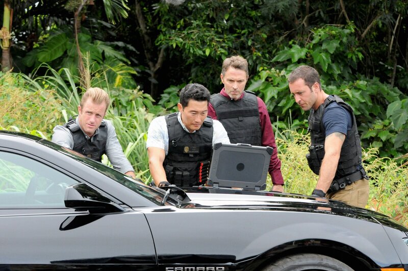 Während Adam und Kono um ihr Leben kämpfen, ermitteln Danny (Scott Caan, l.), Chin (Daniel Dae Kim, 2.v.l.) und Steve (Alex O'Loughlin, r.) in einem neuen Mordfall und stoßen dabei auf Ray Harper (Tim Daly, 2.v.r.). Doch was hat er damit zu tun?