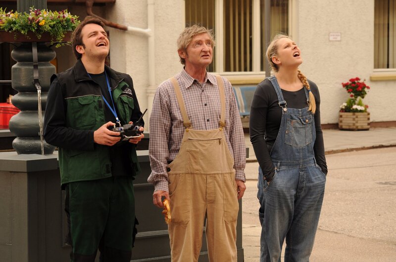 Florian drückt die Fernbedienung und manövriert den Heli Richtung Dachrinne. Von links: Florian Brunner (Tommy Schwimmer), Xaver (Michael Schreiner) und Yvonne Preissinger (Alexa Eilers).