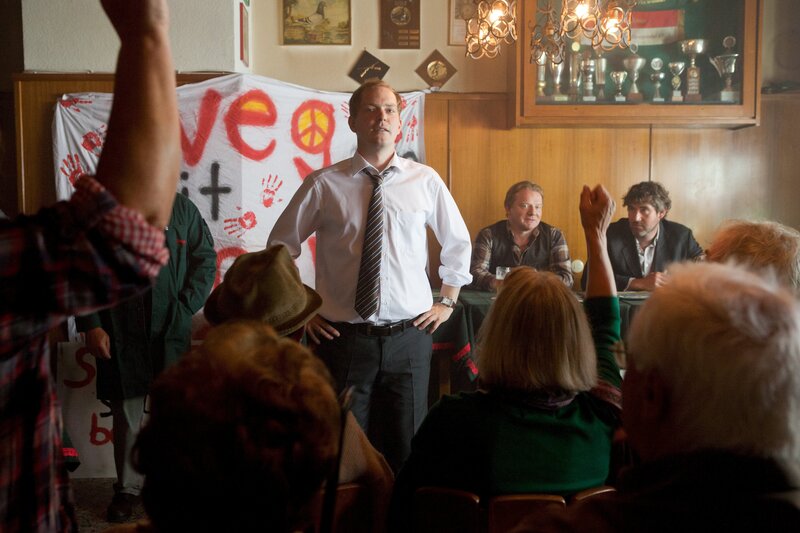 Auf der Bürgerversammlung versucht Oliver Brandstetter (Godehard Giese, M.) die aufgebrachten Dorfbewohner von der Notwendigkeit des Verbleibs des Stromnetzes bei seinem Unternehmen zu überzeugen.