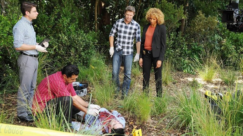 Die Ermittler (v.l.) Daniel Green (Jordan Wall), Carlos Sanchez (Carlos Gomez), Jim Longworth (Matt Passmore) und Colleen Manus (Michelle Hurd) suchen am Tatort nach Spuren.