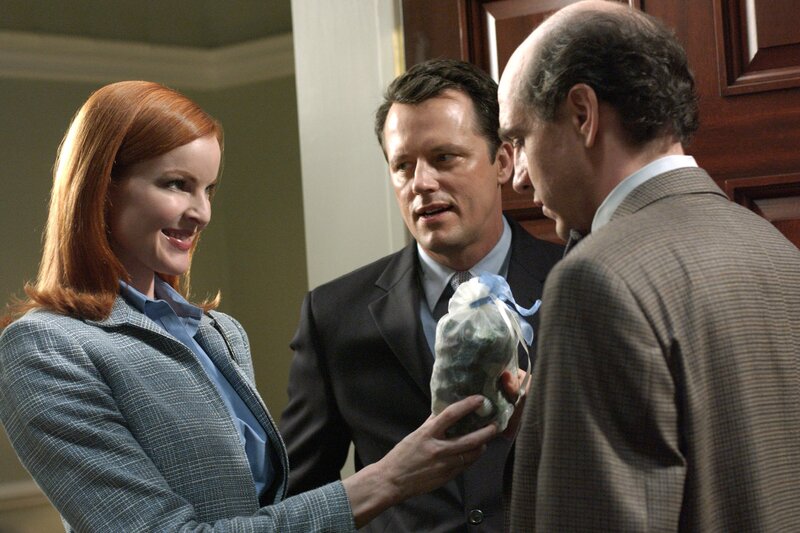 • 100961_2219 -- DESPERATE HOUSEWIVES - "Ah, But Underneath" -- Gabrielle goes to great lengths to hide her affair, Lynette tries tough love to discipline the twins, Bree and Rex attempt marriage counseling, and Susan musters the courage to invite Mike Delfino to dinner, only to have Edie horn in on her big night. Meanwhile, the ladies can't decide what to do with the disturbing note they found in Mary Alice's things, on "Desperate Housewives," SUNDAY, OCTOBER 10 (9:00-10:00 p.m., ET) on the ABC Television Network. (ABC/RON TOM)MARCIA CROSS, STEVEN CULP, SAM LLOYD DESPHOUSE_Y1_2C_L
