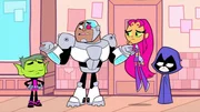 v.li.: Starfire, Beast Boy, Cyborg, Robin, Raven