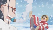 Ruffy, Franky und Robin wollen Caesar entführen, doch Smoker versucht, Ruffy festzunehmen. Law schleicht sich währenddessen mit Chopper ins Labor, um die Zusammensetzung der Drogen herauszufinden. In der Höhle sind mittlerweile die Kinder aufgewacht und zeigen starke Entzugserscheinungen.