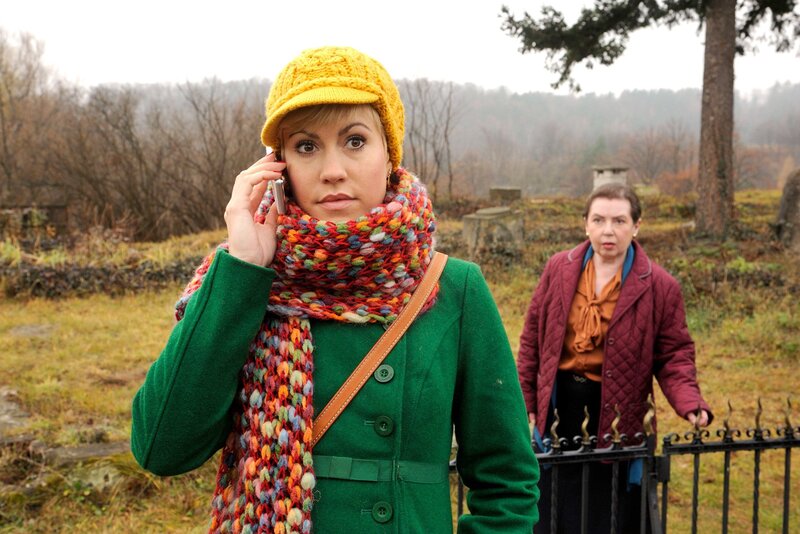 ARD HEITER BIS TÖDLICH - ALLES KLARA II, FOLGE 17 (WH.), "Im Namen des Vaters", am Donnerstag (07.08.14) um 18:50 Uhr im ERSTEN. Klara (Wolke Hegenbarth, l.) mischt sich in Kleinerts Ermittlungen ein und schaut sich auf dem Quedlinburger Friedhof um, Tatort eines Mords. Sie bemerkt nicht, daß Hermine Malinckrodt (Simone von Zglinicki) sich hinter ihrem Rücken anschleicht.